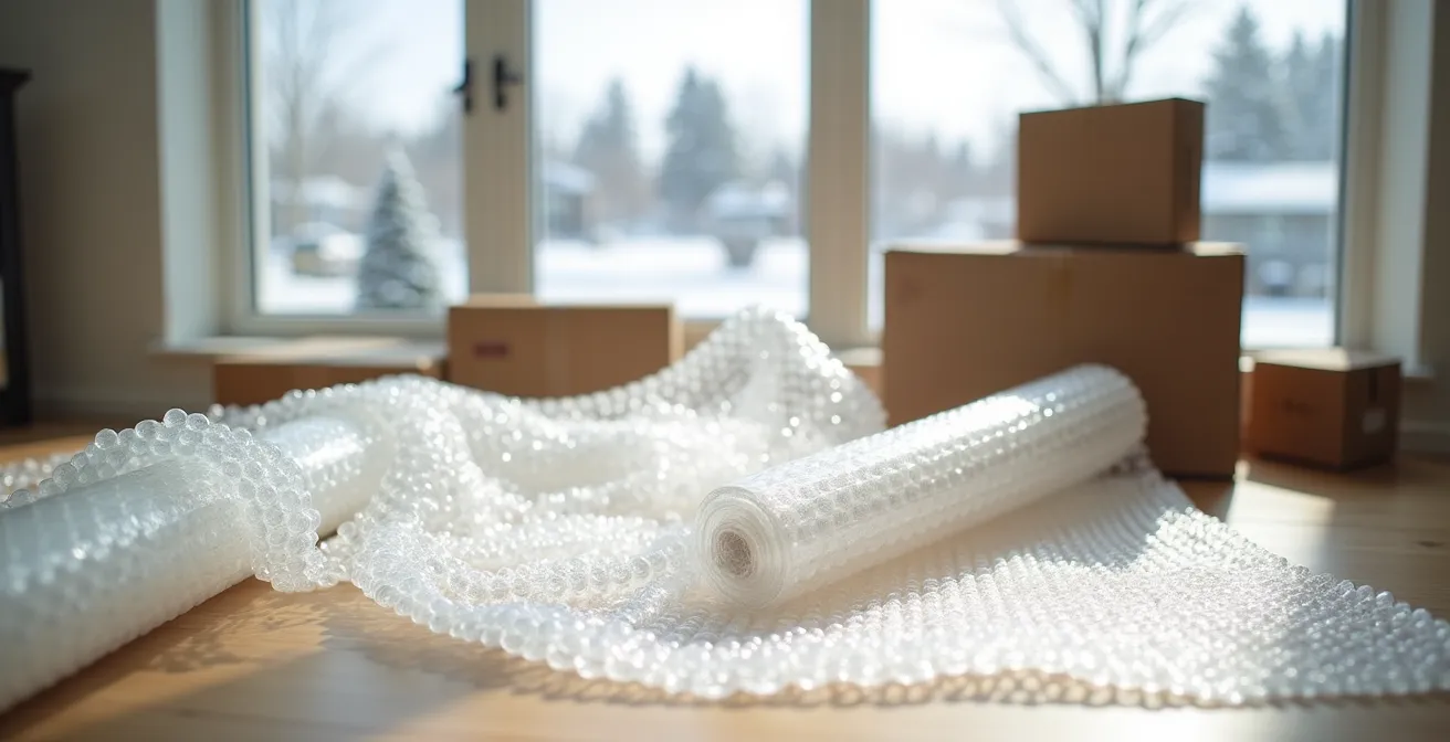 - Protection thermique d’appoint : Les bulles d’air sont un excellent isolant. Pour des plantes d’intérieur fragiles ou des liquides sensibles au gel (vins, produits de beauté) lors d’un déménagement en hiver, envelopper les contenants ou le pot dans du film à bulles crée une barrière thermique efficace. Cette technique peut même servir à isoler temporairement une fenêtre dans une pièce fraîchement aménagée.